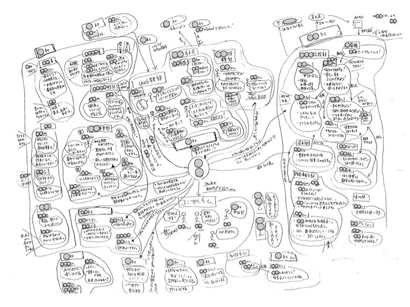 描き上がった「リッチピクチャー」を見た時、膨大な情報がいかにつながってどのような関係になっているかを把握でき、きっと、今まで気づかなかった新たな気づきが起こることでしょう。
